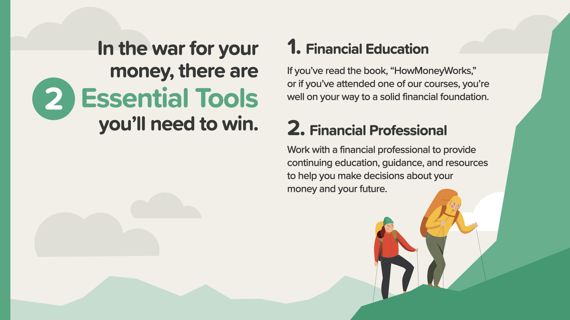 In the war for your money, there are 2 essential tools you’ll need to win. We know that the best starting point for everyone is to combine a financial education with a financial professional. Take this education seriously. You didn’t get this from school, your parents, or friends. Treat your finances with the level of dedication you put into your health. Google things, ask questions… but then turn to someone you trust that does this for a living.