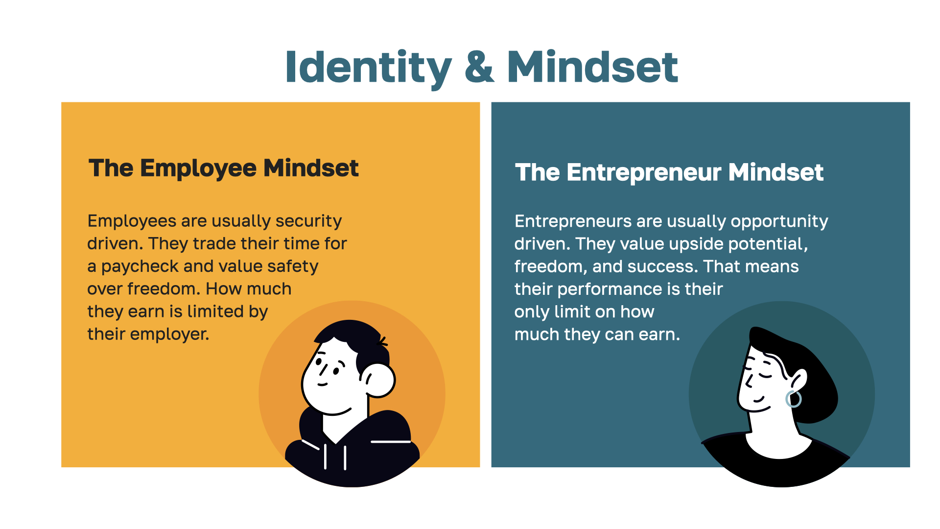 The simple fact is that you cannot out-earn your identity. The "employee mentality" will limit your income potential, while an "entrepreneur identity" expands your horizon and equips you to thrive in the future.